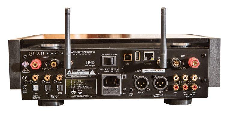 转到机器的背面,那丰富的接口明明白白告诉我们这是一款名副其实的多功能一体机。除了内置CD*放播**作为重要的音源,还备有两组RCA模拟信号输入端子、LAN网线接口、USB-A与USB-B接口各一个、同轴和光纤数字输入各两个,这还不够,Artera one内置无线网卡和蓝牙音频传输模块,可作无线连接串流*放播**之用,支持蓝牙和UPnP无线连接,支持AirPlay、Spotify、Internet连接,支持最高32bit/384kHz和DSD256的音乐文件。另外,Artera one还备有同轴、光纤数字输出接口各一,RCA和XLR模拟输出各一,即使是外接数字有源音箱或者额外的后级功放、有源超低音等等,都可以和Artera one友好相处。可以这么说吧,除了不具备唱头放大器和调谐器外,Artera one是QUAD有史以来功能最齐全的音乐中心,通过它可以满足任何音乐*放播**的可能。具体所能对应的数字格式和规格请参阅规格表,在此不再赘述了。