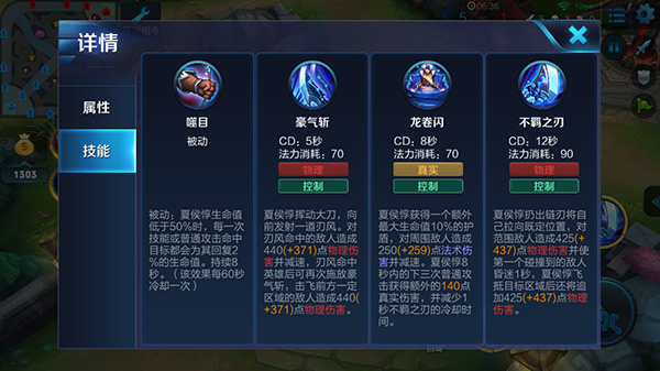 夏侯惇挥动大刀,向指定方向斩一道刃风,对路径上的敌人造成240/290/340/390/440/490(+100%物理加成)点物理伤害并减少其50%移动速度,持续2秒;刃风命中英雄后可再次挥动大刀向指定范围方向释放豪气斩,豪气斩会造成240/290/340/390/440/490(+100%物理加成)点物理伤害并将范围内敌人击飞1秒