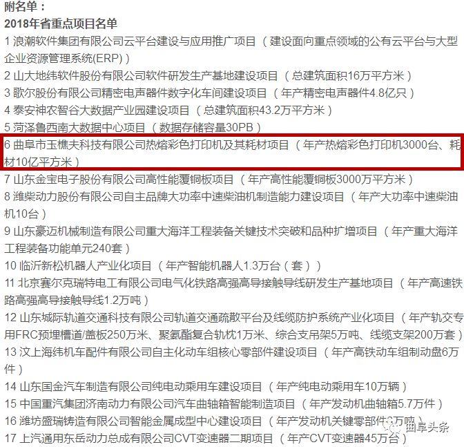 4月12日,从省发改委传出消息,2018年山东省重点项目名单出炉,已于近日以省政府文件下达。110个项目中,建设项目100个、准备项目10个,总投资5420亿元、年度计划投资1020亿元。其中,曲阜市玉樵夫科技有限公司热熔彩色打印机及其耗材项目(年产热熔彩色打印机3000台、耗材10亿平方米)名列其中。