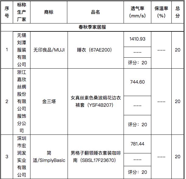 在透气率上,春秋季家居服样品的比试中,“无印良品”、“金三塔”、“简适”3款样品得满分,透气性能表现优异。