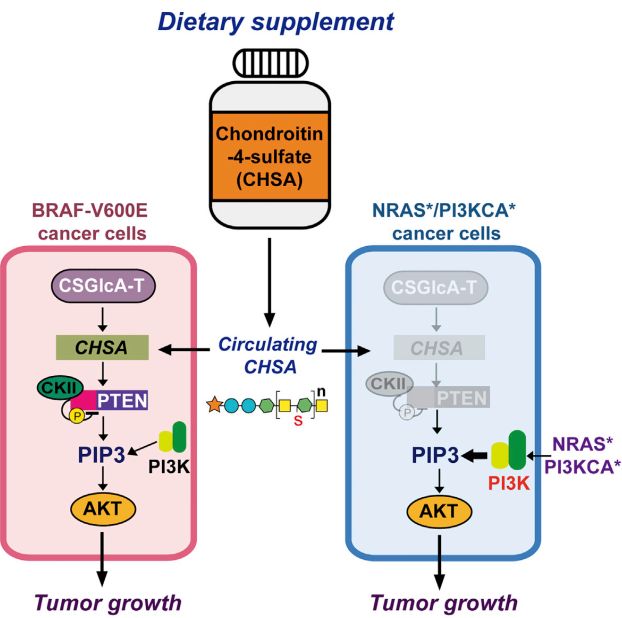 Jing Chen教授团队就是在研究BRAFV600E突变黑色素瘤中发现,一种与软骨素相关的酶居然是一个十分重要因素!这种酶叫做硫酸软骨素葡萄糖醛酸转移酶(CSGIcA-T,CSG),它是软骨素合成过程中的关键酶,在BRAF V600E突变黑色素瘤中表达异常升高。所以研究者这才把硫酸软骨素补剂和黑色素瘤联系起来。