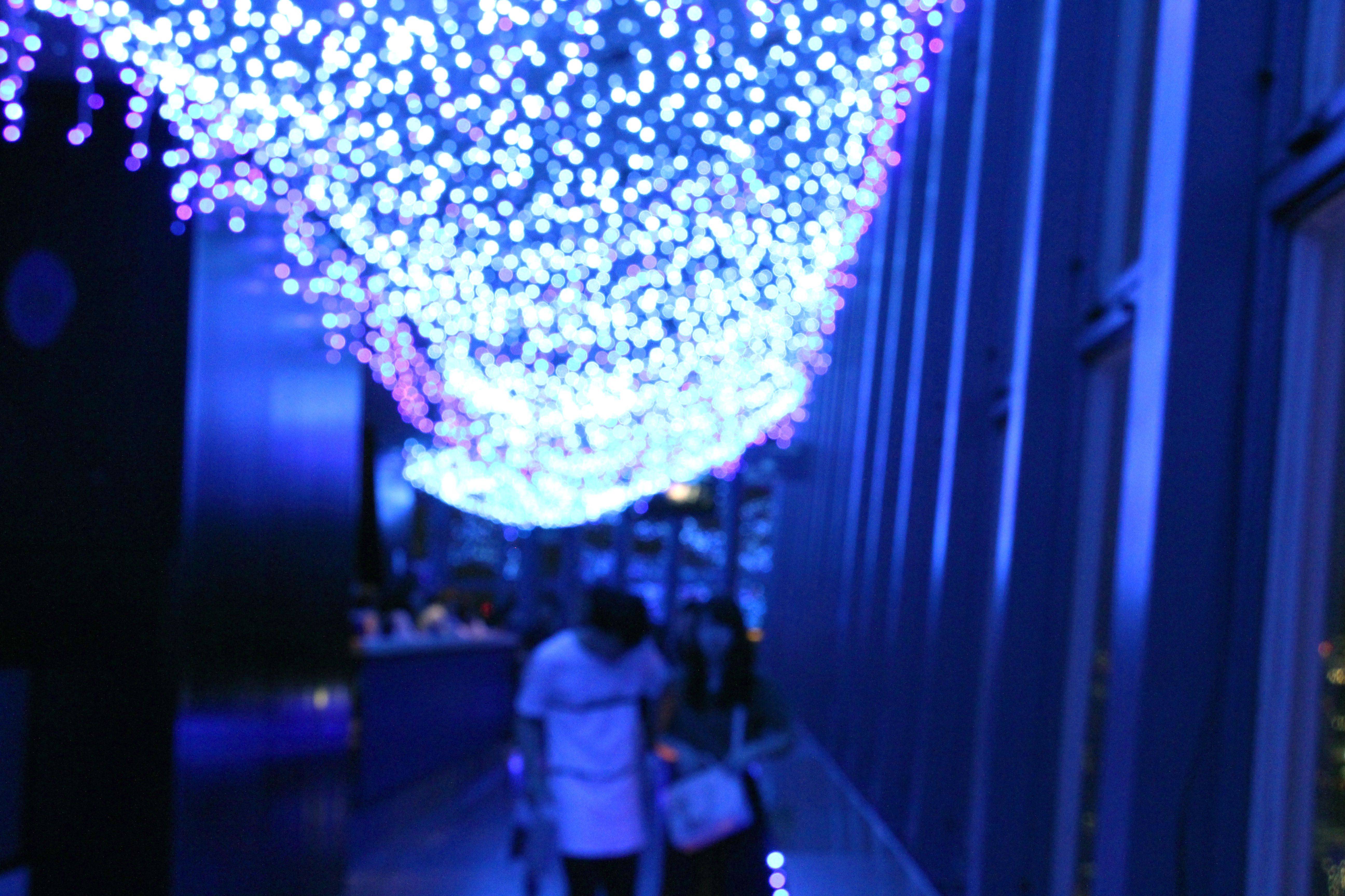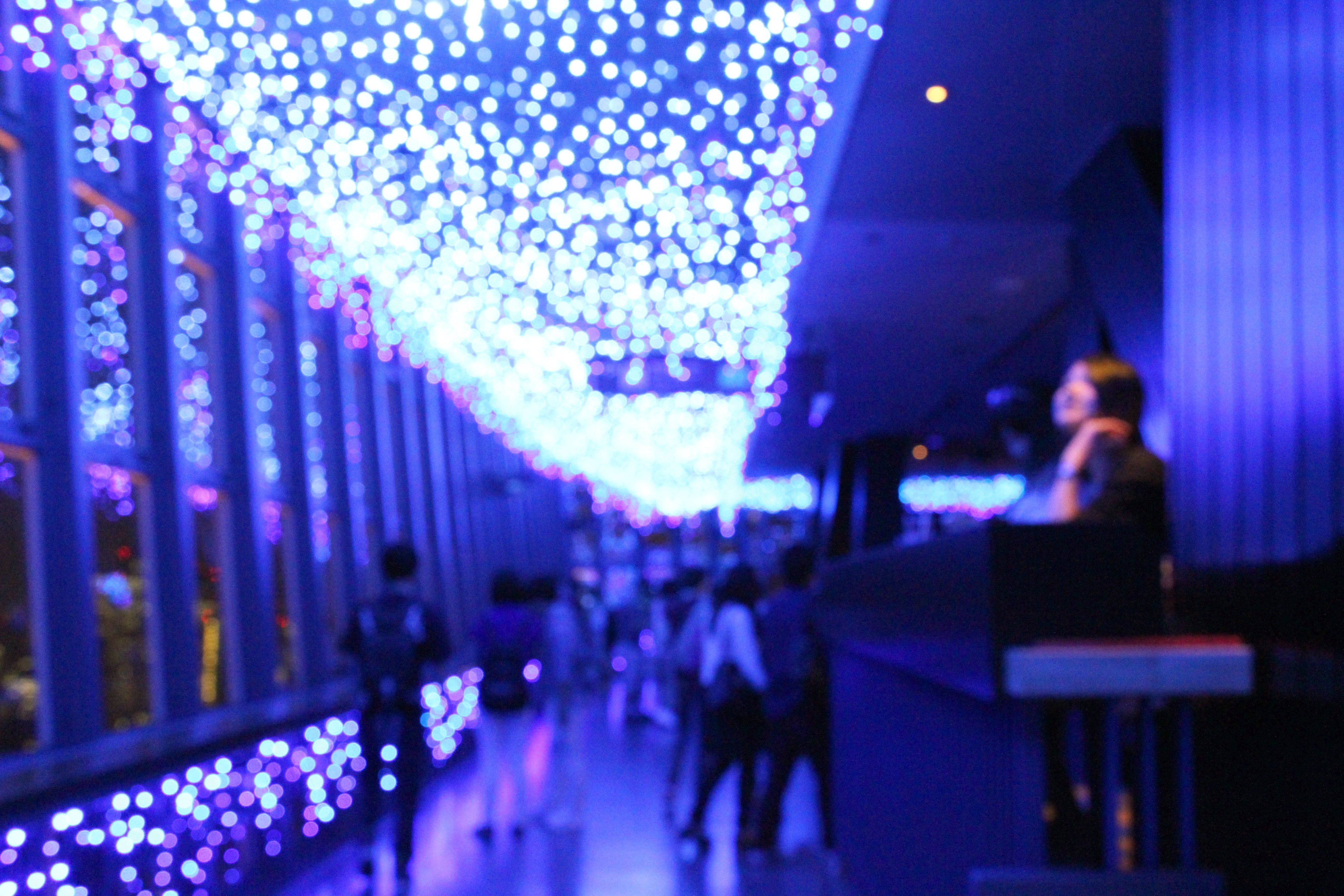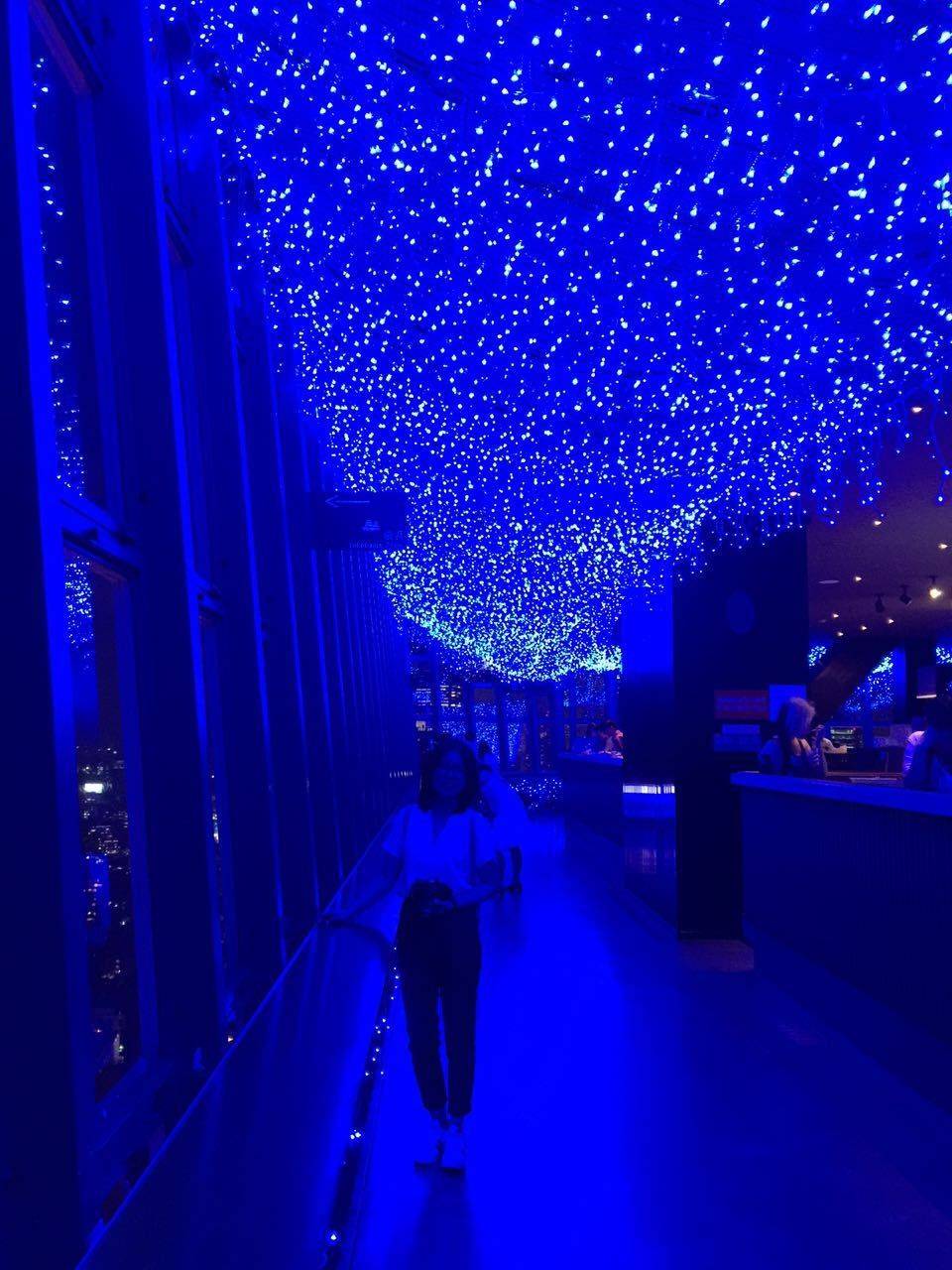 下来之后被灯饰惊艳!整个这一层都用蓝色的灯装饰,映在玻璃上,叠合外面的夜景美呆!老妈不停发出:呀!好美~