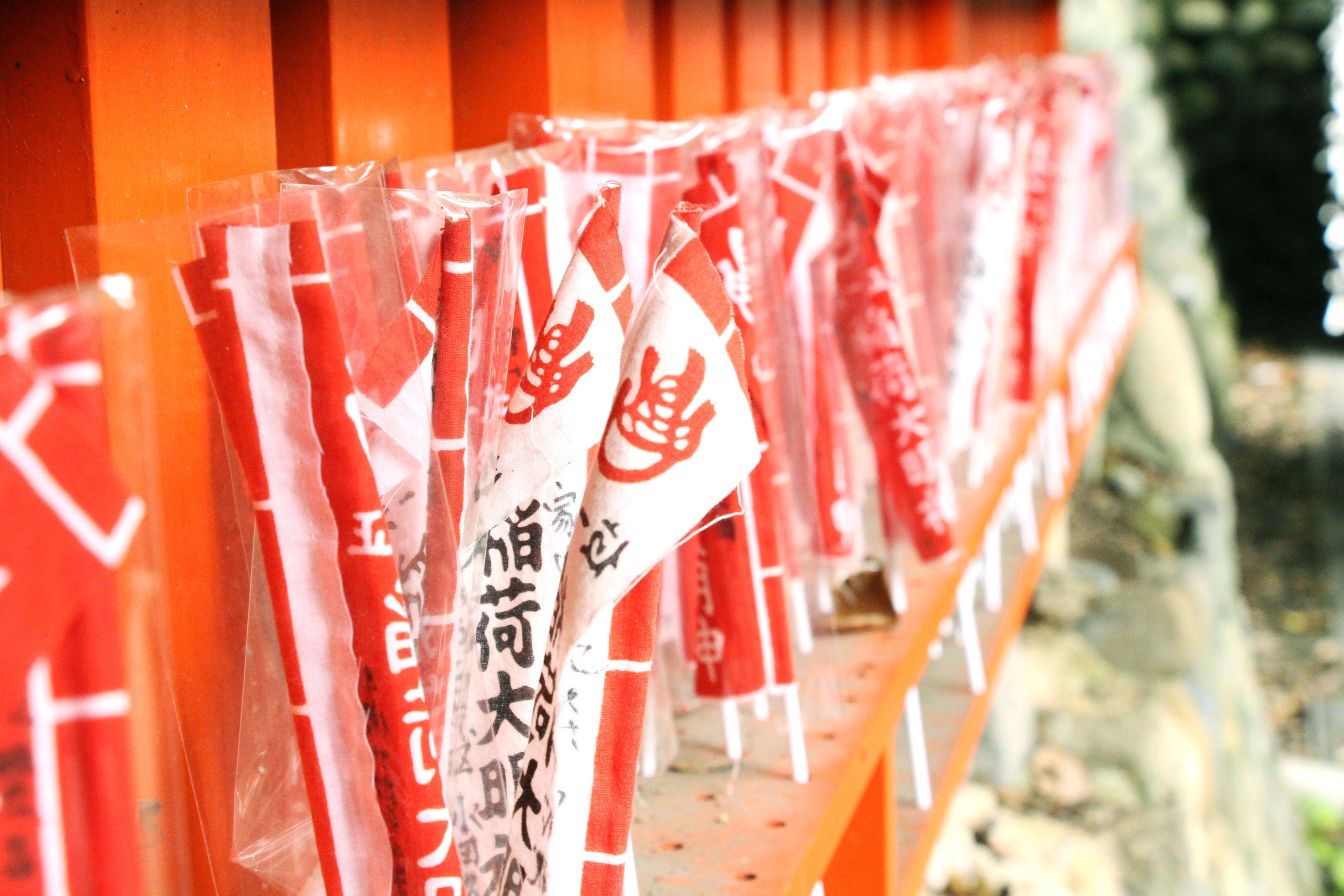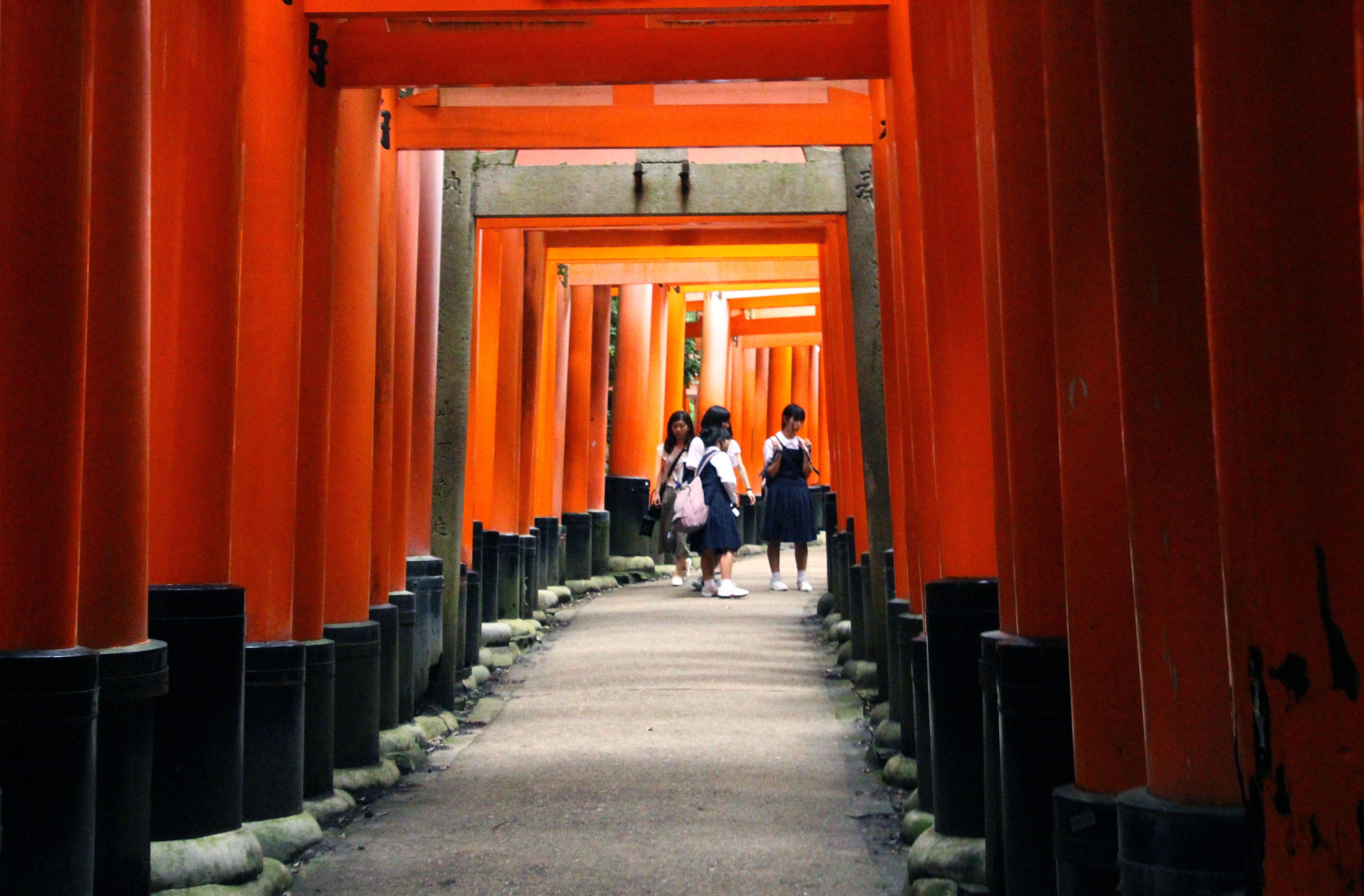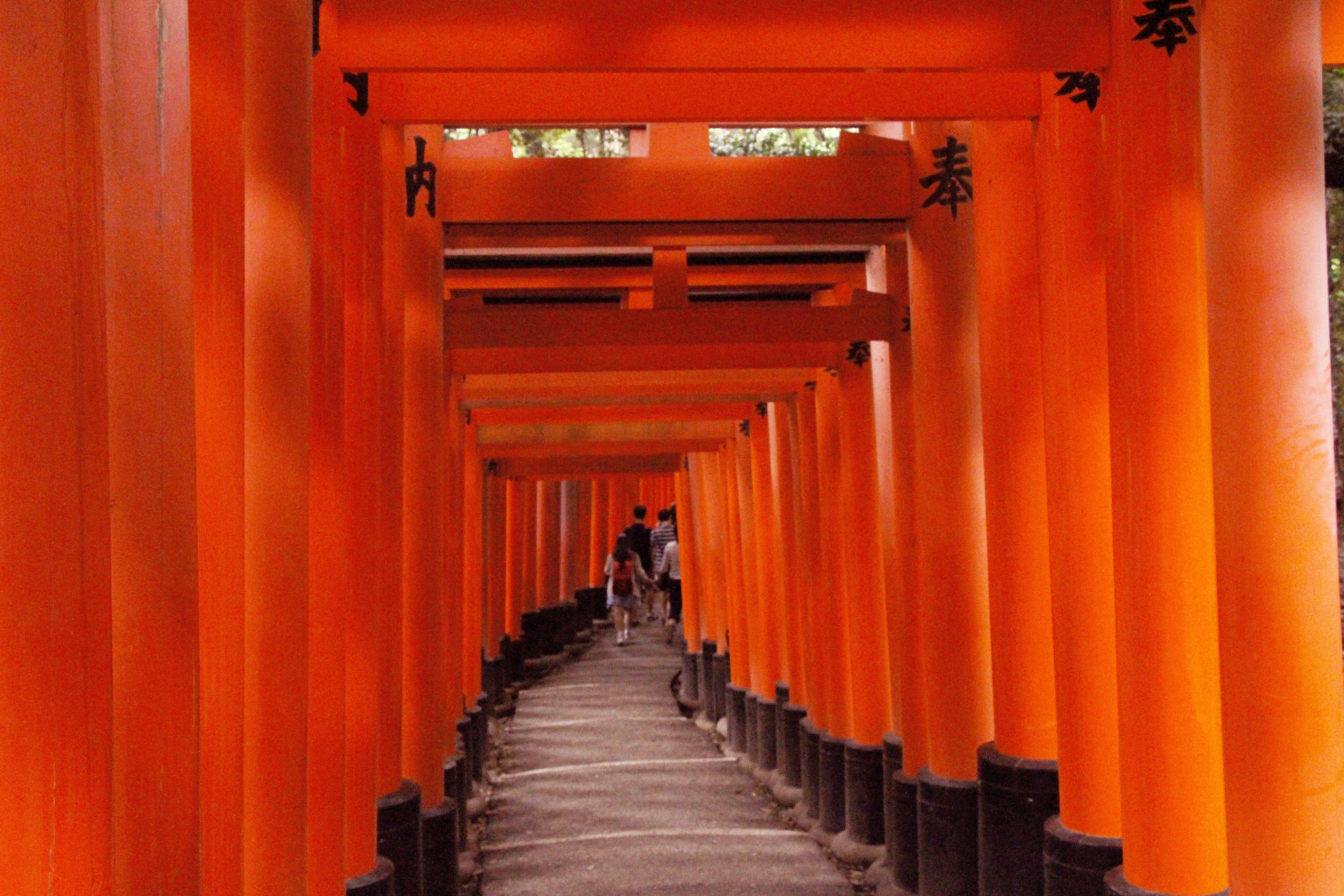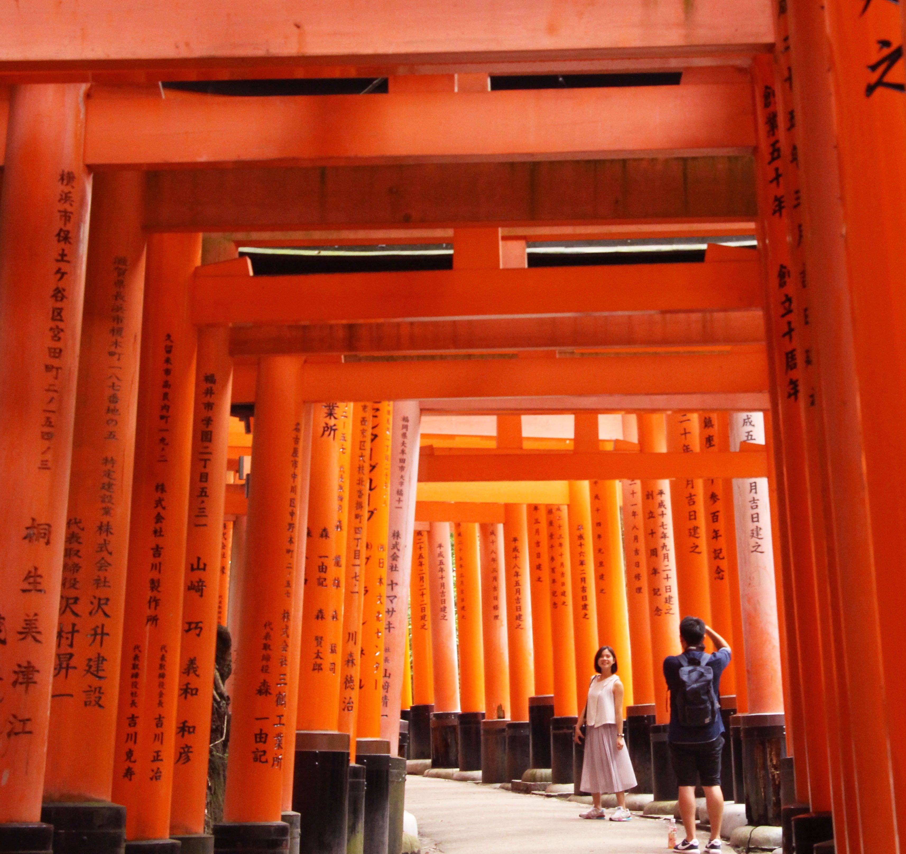 许多工商团体会来这里祈求保祐。在回去之後,可能赚了钱,之後就要来还愿,所以就会在这里建鸟居以还愿,久而久之,这里的鸟居就会愈来愈多,到最后,就成了这样的景观,绵延好几公里的鸟居就在稻荷山上,如果全部走完需要三个半小时左右。而每一个鸟居也都有所不同,比较有钱的就做大鸟居,没钱的就做小鸟居,所以还有的地方会一分为二,由两条通往同一个地方的隧道所组成,如此可以容纳更多的鸟居。