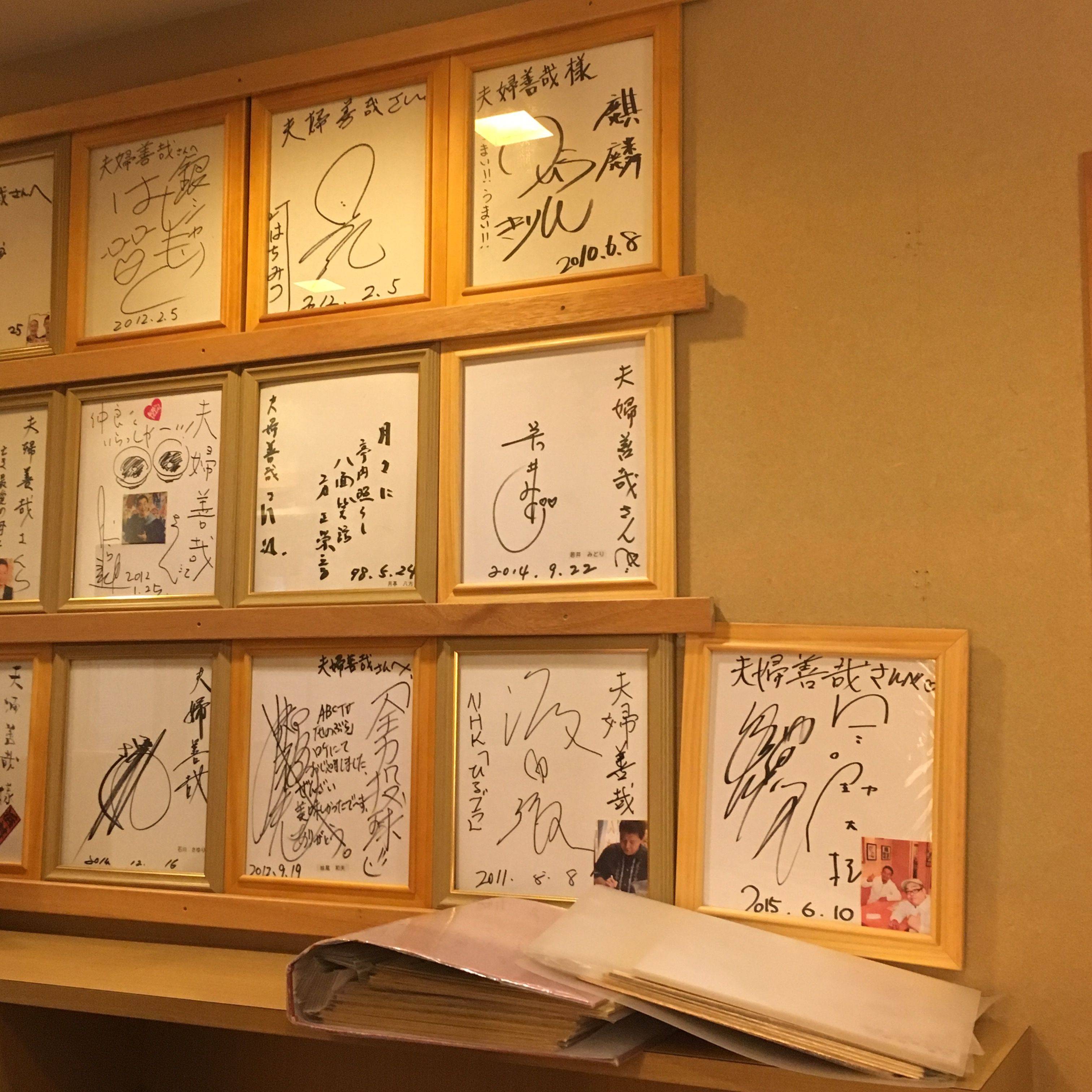 红豆年糕汤是两碗,有美满姻缘的寓意~ 看了小说里的故事之后,感觉很美好,就想来品尝~ 于是买完东西,我们在google map上输入店家,步行到法善寺横丁。红豆汤甘甜,一个小糯米丸子特别软糯~ 配有盐津昆布,为了解腻!我们稍微尝了一点,特别咸!!幸好没有最后一口吃掉... 店内只有三张桌子,空间很小。是一位穿和服的太太在做甜品~ 墙上也有很多名人的签名呢!