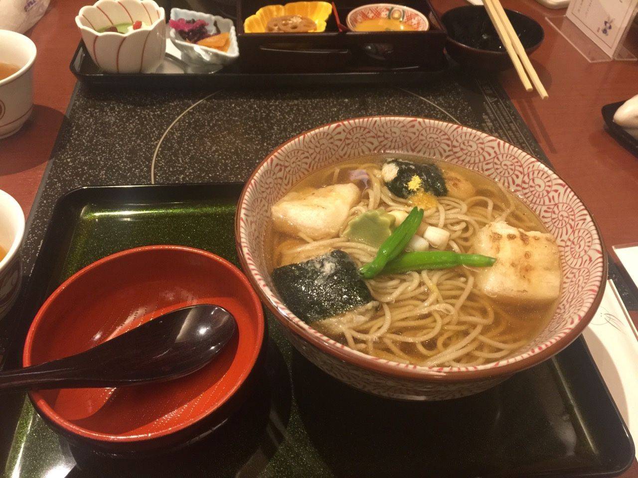 到达酒店之后,我们在新宿站内的伊势丹百货里就餐。老妈点的soba里,年糕特别好吃!!是她选出来的在日本最喜欢吃的一餐 我选择了乌冬定食。面条的汤底在旁边那个酒壶(?)里!原以为是一壶酒的!面里有白萝卜泥,搅拌之后带一点点苦涩,但很清新!小菜和抹茶甜品都很好吃~