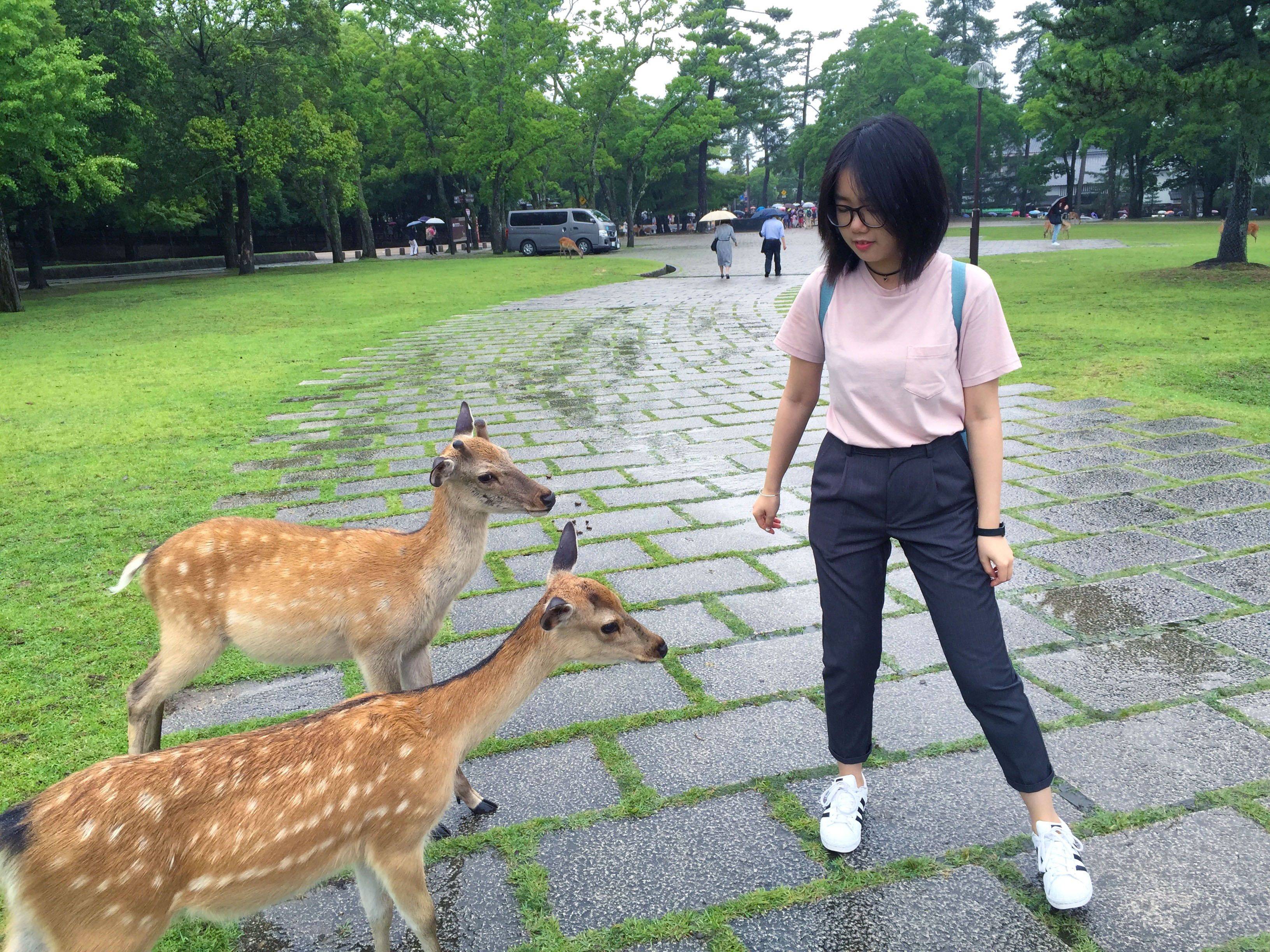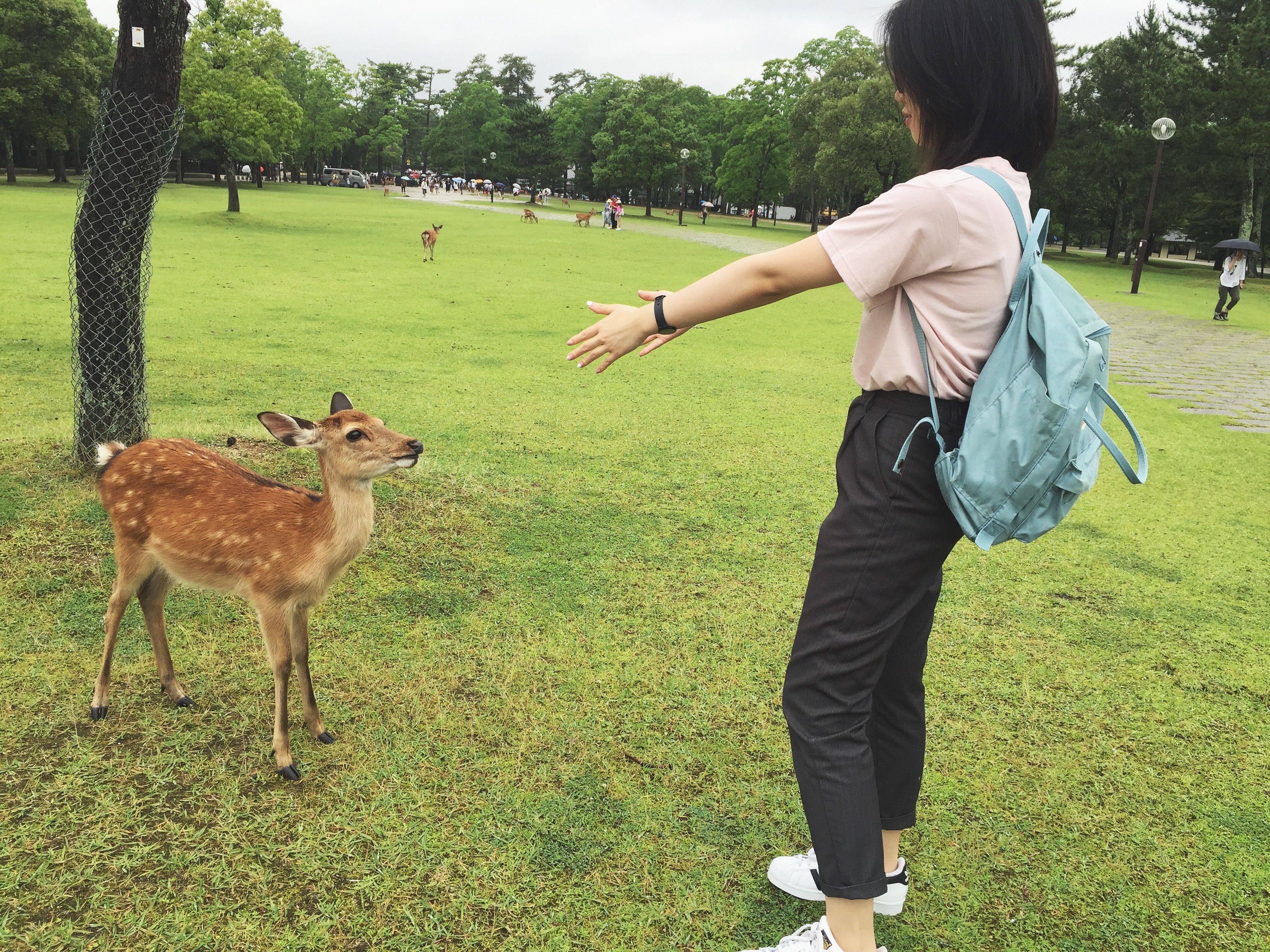 吸取被*攻围**的教训,我们找到一片草地,游客也少,有很多鹿是独自走动的。我们就找一两只鹿来喂,这样就好多了~ 还可以亲密接触,吃东西的时候会很乖地让你摸摸~ 喂完可能会一直跟随着你,这时候我只能装冷漠,摊手!(想要抱抱和bobo的我被鹿无视)