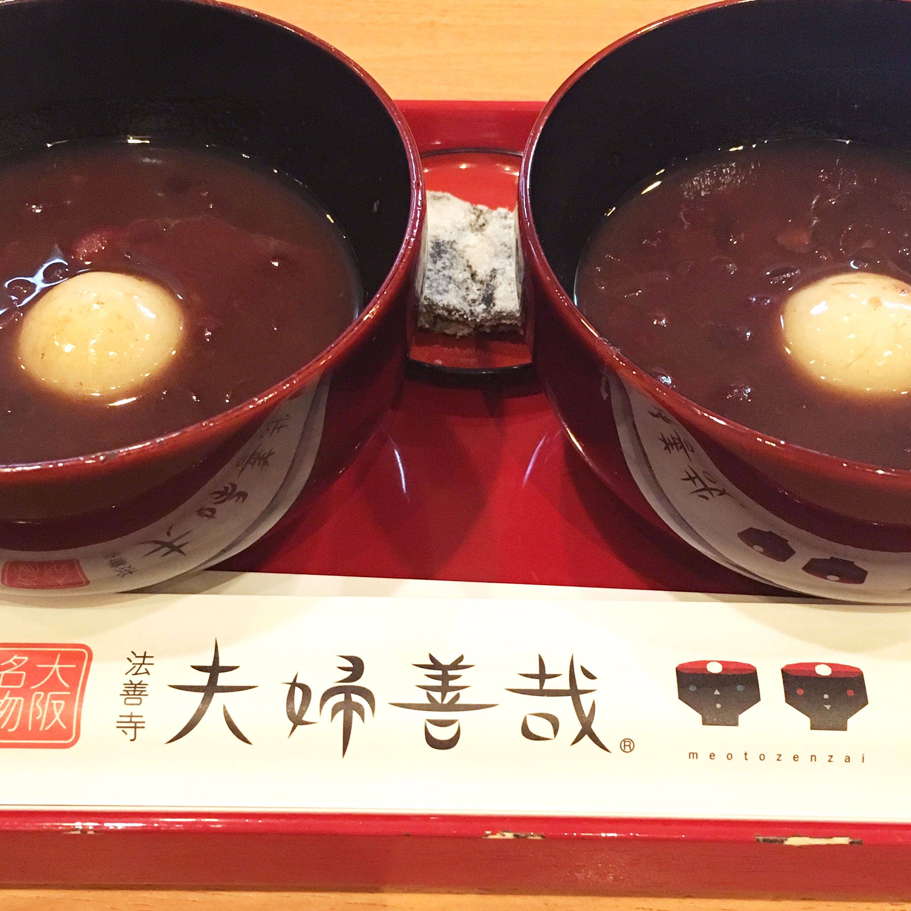 当天大阪下雨,再加上持续这么多天的旅行,我实在有些累!就没有品尝计划里列的那些美食!但去了非常想去的夫妇善哉!这家店创立于明治16年,原名叫“御福”。名物是红豆年糕汤,现在也有抹茶和红豆冰粥~ 小说家织田作之助的小说《夫妇善哉》里以法善寺横丁为背景,描写了主人公来这家甜品店的一个场景。小说中把“御福”改名为夫妇善哉,后来小说和电影出名后,甜品店也改名。
