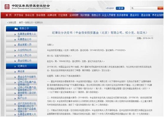 协会决定,(1)撤销中金信安私募投资基金管理人登记;(2)对郑小龙、赵亚光公开谴责、加入黑名单。上述纪律处分记入资本市场诚信档案。
