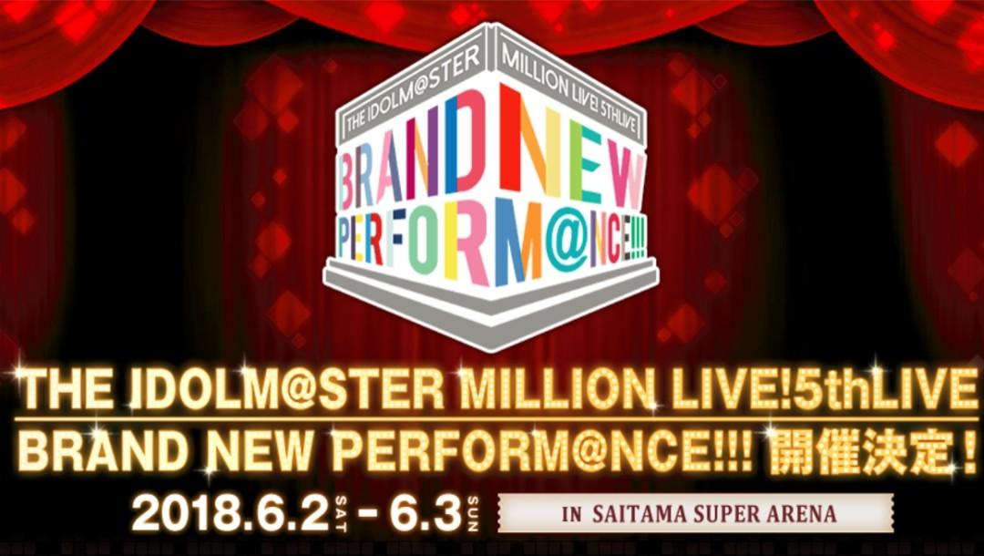 - 主题:THE IDOLM@STER MILLION LIVE! 5thLIVE BRAND NEW PERFORM@NCE!!! 1日目 地点:東京/さいたまスーパーアリーナ 出演:山崎はるか、平山笑美、香里有佐、南早紀、末柄里恵、伊藤美来、麻倉もも、戸田めぐみ、村川梨衣、中村温姫、郁原ゆう、雨宮天、近藤唯、渡部恵子、原嶋あかり、小笠原早紀、高橋未奈美、阿部里果、木戸衣吹