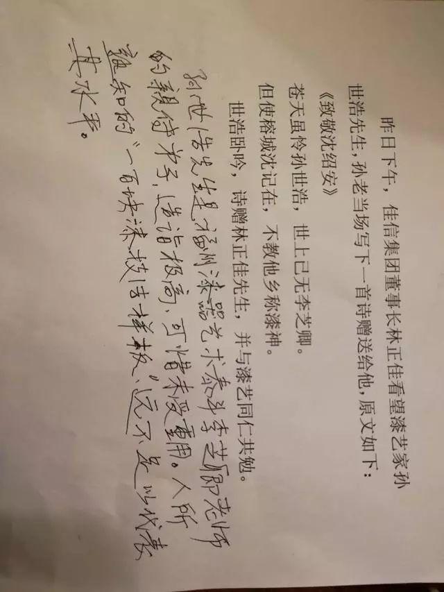 孙世浩老先生用颤抖的手,在记者的采访本上写下了一首《致敬沈绍安》,并签下自己的名字。原文摘录如下:戊戌年二月初八——《致敬沈绍安》