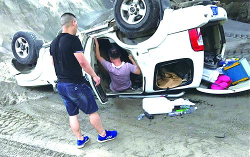 县环境保护监察大队一中队在执法过程中遭遇翻车。 县环保局供图