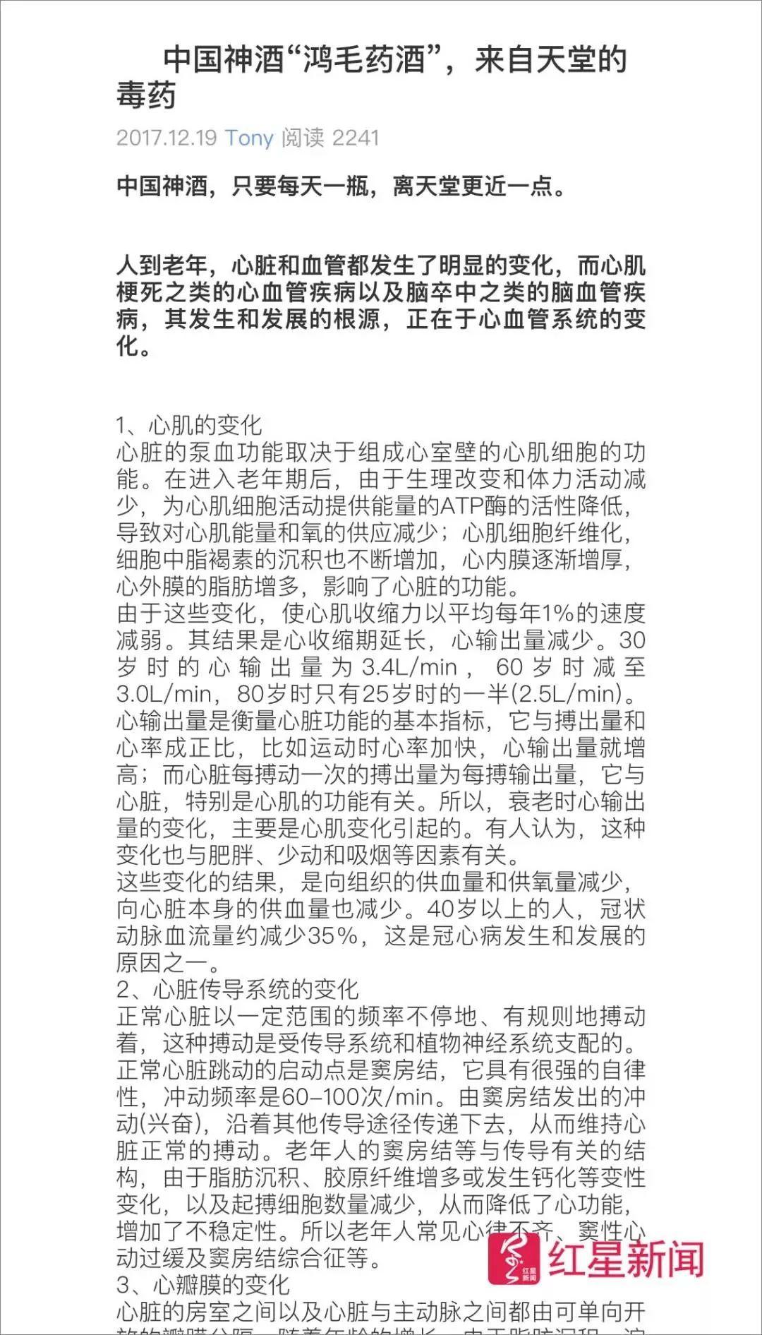 去年12月,拥有麻醉医学硕士学位的医生谭秦东在“美篇”发表了《中国神酒“鸿毛药酒”,来自天堂的毒药》,文章从心肌的变化、血管老化、动脉粥样硬化等方面,想说明鸿茅药酒对老年人会造成伤害。表述本身是有一定科学依据的,但是标题却使用了情绪化的“毒药”一词。今年1月,内蒙古凉城警方以“损害商品声誉罪”抓捕了谭秦东医生。