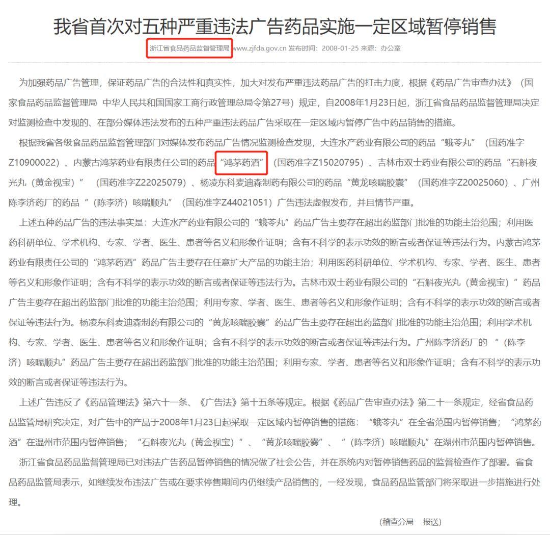 要知道一个事实:在这篇文章之前,鸿茅药酒已经在市场上饱受质疑。有媒体根据近十年的职能部门的公告文件做出不完全统计,鸿茅药酒广告曾被25个省市级食药监部门通报违法,违法次数达2630次,被10省市18次采取暂停销售的行政强制措施。