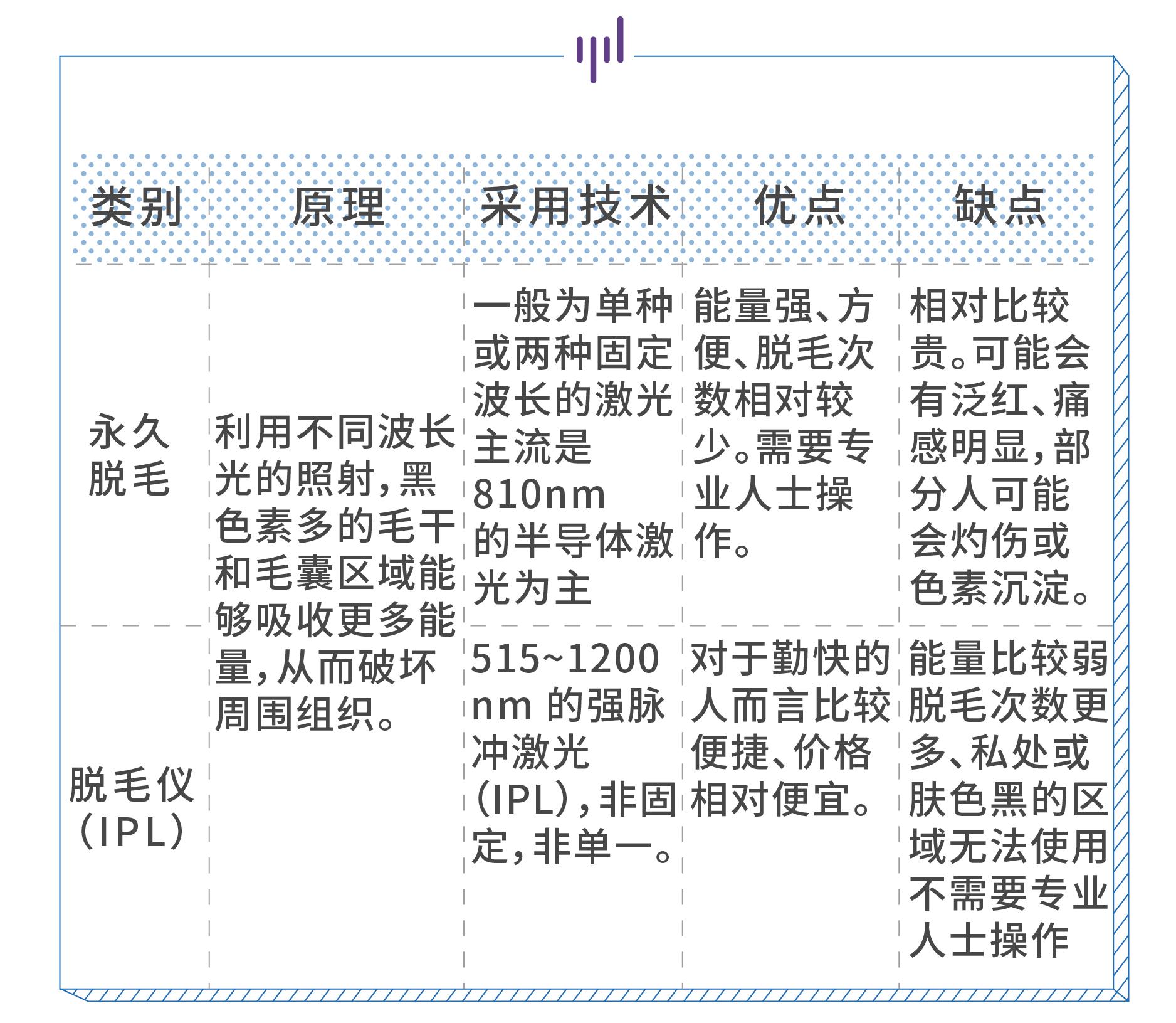 PS. 永久脱毛和家用脱毛仪都需要先进行除毛步骤,刮除表面毛发。永久脱毛并非永远不长,而是数年没有或者只有少量毛发,具体效果因人、因次数而异。