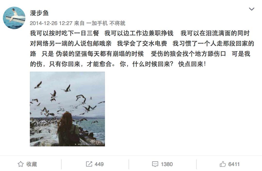 微博有一位叫“漫步鱼”的失联家属,她一直都没有放弃,一直在等待,这种耐心让人看了也是痛心。从2014年到现在,她未曾放弃,她的每一条微博都在等他,他到底什么时候才能回家...