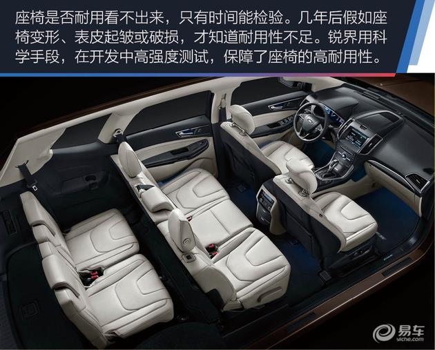座椅的耐用性常常被消费者所忽视,其实这是关乎座椅舒适性的关键。假如座椅的包覆皮革容易起皱甚至破损,坐上去觉得硌屁股,哪还有舒适性可言。为此,福特在开发锐界的座椅时,通过2.5万次上下车模拟测试来检测、保证座椅的耐用性,还通过假人的颠簸蠕动测试来保证较低的表皮起皱损害率。