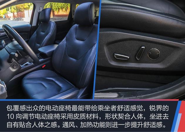 锐界的ANC主动降噪技术带来的“高级感”主要体现在听觉方面,要全方位的“高级感”,特别是触感,就不得不提锐界的前排座椅,除入门版外所有车型的前排座椅达到了10向电动调节,包括靠背、高低、前后还有腰部都可以调节,且有加热功能(高配版同时还具备通风功能),堪比豪华轿车。