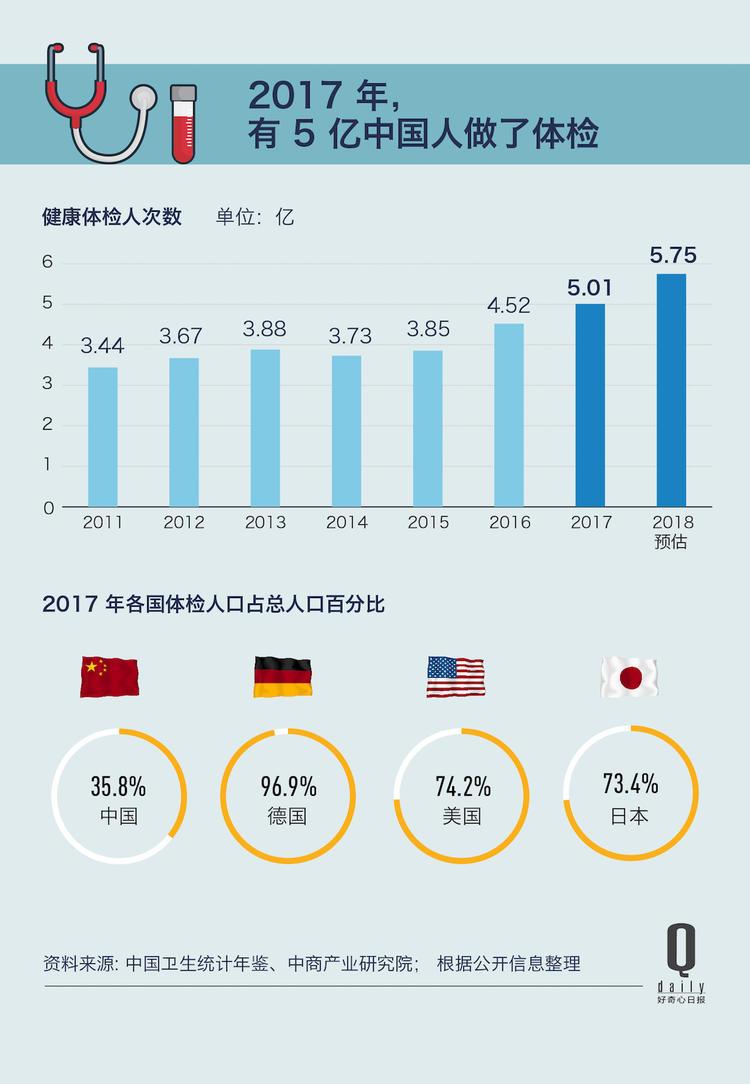 《中国卫生和计划生育统计年鉴》的数据显示,2017 年全国体检人数增长到 4.56 亿人次,占全国人口的约 1/3。