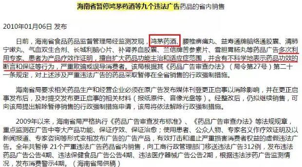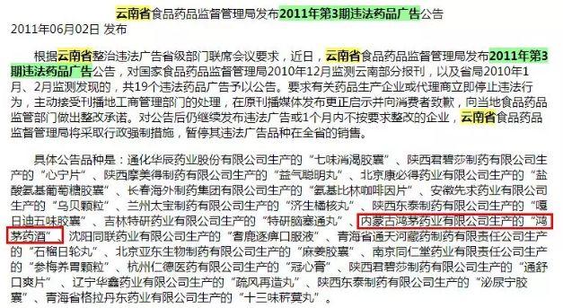 在过去 10 年间,据不完全统计,鸿茅药酒广告曾被江苏、辽宁、山西、湖北等 25 个省市级食药监部门通报违法,违法次数达 2630 次,被暂停销售数十次。