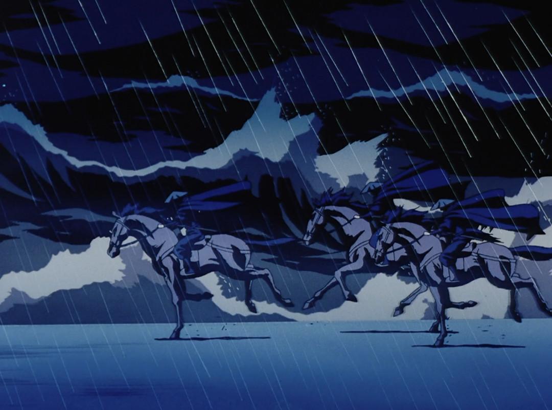 上回说到,当川尻先生得到优秀的脚本家助力时,作品会达到惊人的完成度。而在《机动刑事808》之后的首部长篇OVA《兽兵卫忍风帖》里,川尻则向世人展示了自己在脚本创作方面的天赋——这部92分钟的长篇动画完全由他原创,从脚本到分镜到角色原案均由一人完成,堪称彻底的川尻式作品,他的美学在此作中体现得淋漓尽致,观众们可以尽情欣赏天才的炫技。
