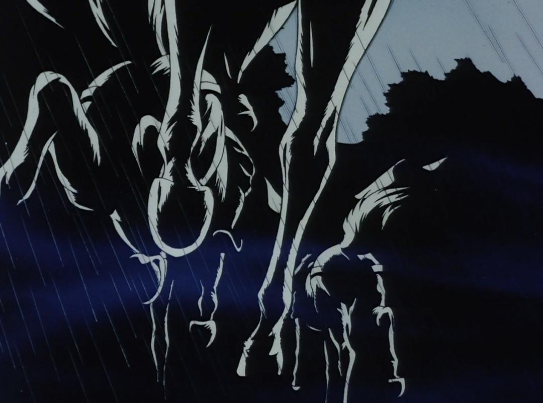 之后甲贺组长半佐被铁斋撕扯成几段,阳炎被抓,随即进入预想中的(误)*暴强**戏份和兽兵卫登场后的英雄救美戏份。上世纪的OVA对性的表现大多并不避讳,并且会加以精心刻画——铁斋吮吸阳炎身体的部分大多采用一拍二,时间点抓得精妙,动作的韵律感很强,赏心悦目。这一段也使用了川尻喜欢的高对比浓重BL影(纯黑影)加蓝色调暗面。阳炎的肌肤也笼罩一层暗蓝色,兽兵卫出场时半个人都全部笼罩在黑暗中——这种高对比度阴影,是川尻风格中被人们指出颇有美式漫画感的部分之一。而随后登场的手拈朝颜花的美少年百合丸、点点萤火中的阳炎,这样之类的自然景物与人情相融合的纤细描写,又是弥漫着和式“*美耽**”感的,是监督审美积淀的(有意识或无意识的)流露。