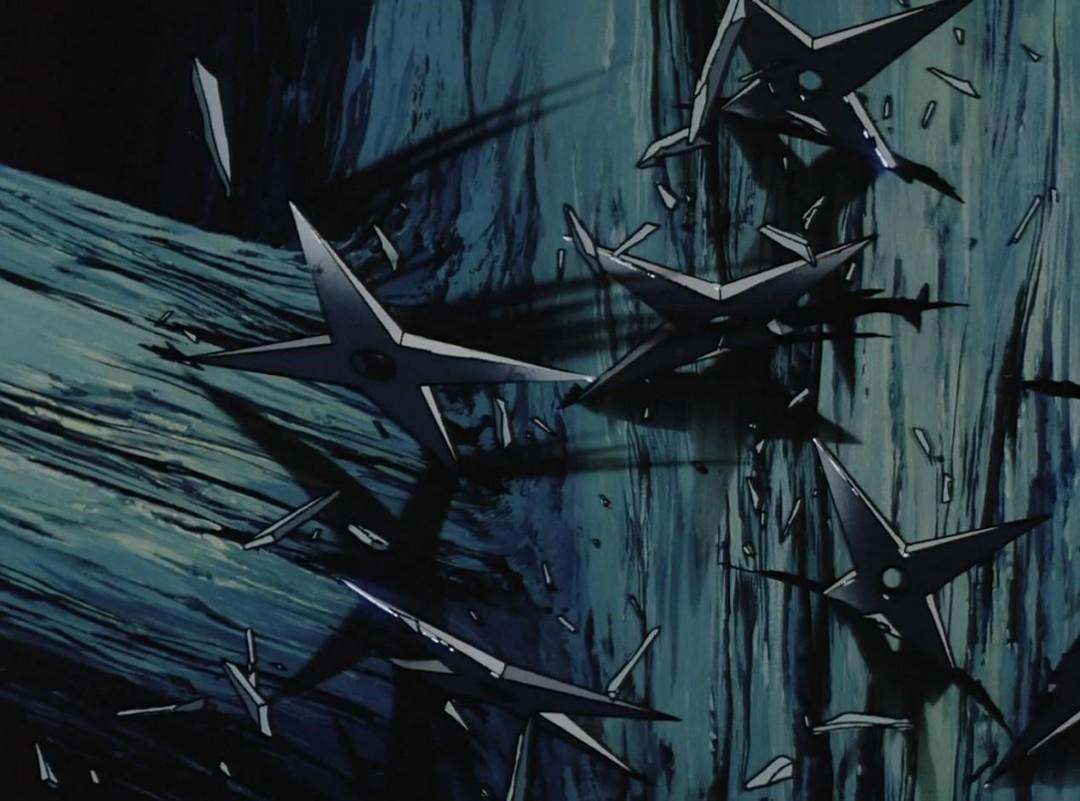 至此是一段文戏的结束。因为文戏中有大量新角色(包括一名极富魅力的女性角色)登场,所以并不会使人厌倦。随后又是令剧情升温的武戏:反派铁斋的飞刃将甲贺忍者们斩为无数段,电光闪烁般的手里剑,大量断肢,血雨淋在叶片上。这里手里剑的疾突速度和数量,用川尻的话说已经接近机关枪,是相当非现实、不合理的刻画。川尻认为如果突然让观众看到这种数量级的手里剑之战,会觉得不可信,但由于从最初的饭团之战开始就已经在为非现实的忍者世界做出铺垫,观众们这里看到机关枪式的手里剑便也不至于太无法接受。川尻为如何在“不合理世界中呈现合理性”进行了很多考量,这里是其中一处。