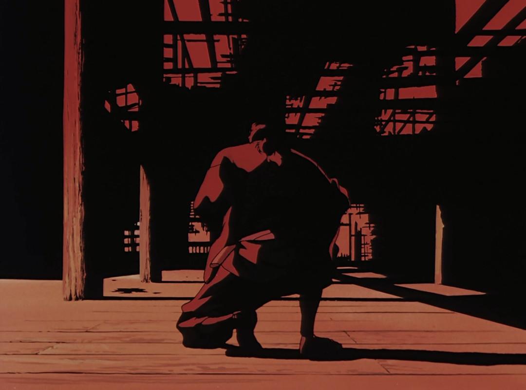 从影片第一小时整(片中时间大约是黄昏)开始,笔者心目中这部电影的美学巅峰便来临了——兽兵卫为解救阳炎,与操纵影子的反派忍者作战。这一段战斗全部使用红黑色调,光影和构图无一帧不优美绝伦。斜阳鲜血淋漓般的凄厉哀艳感、刀刃架在脖颈后一般令人毛发倒竖的锋锐危险感、安定的空间与静默的空气共同构成的紧绷张力,几乎溢出屏幕。