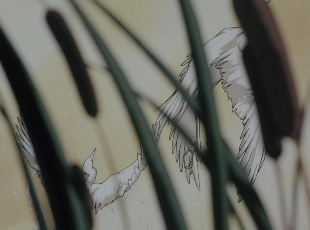 这两组分镜都在为影片“升温”,而一味加热会缺乏张力,亦叫观众审美疲劳。因此两组加热式的分镜之后是降温用的剧情——用一个上拉的pan表现感染瘟疫后下田村的人烟寥落。之前说过,川尻经常对静止画使用pan,但那样会使画面显得无趣。《兽兵卫忍风帖》中他很少再使用单纯的长时间静止画pan,而多少会在pan的过程中加入动态——譬如此处使用了惊飞的乌鸦以打破画面的沉闷。在尸体上啄食的乌鸦的动与尸体的静也产生冲突,使戏剧表现力——即凄惨感的表现力更强。