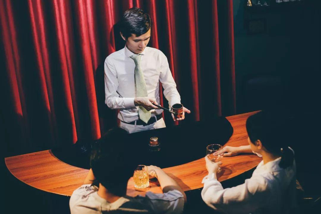 mars 这次点了教父,准备一杯直接进入状态。喝得差不多了就可以摇晃着酒杯来到半圆形的魔术台前欣赏魔术了。这时尼玛泽仁和 Jim 会依次登场,表演近景魔术。