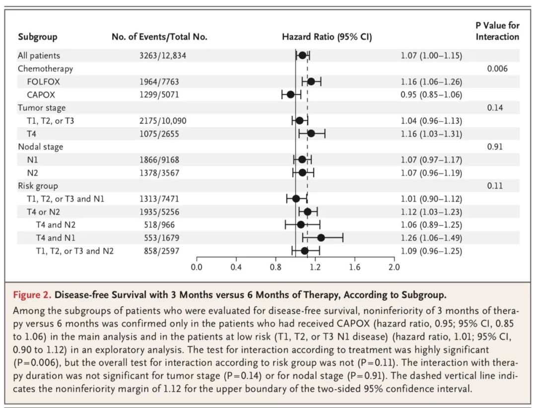 低危组3个月治疗不劣于6个月治疗。其中,采用CAPOX方案的低危患者能得出相同的结论,但采用FOLFOX方案的低危患者却没有。