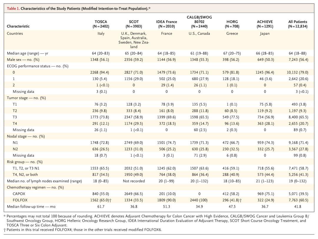 这项研究汇总了6项随机临床III期试验的结果,涉及美国、法国、意大利、日本等共12个国家,纳入了13025名患者,从2007年6月开始持续了八年半,到2015年12月收工,共有3263例患者在随访过程中发生复发或不幸死亡。研究最主要的目的是比较了FOLFOX/CAPOX方案的治疗时间如果从6个月缩短到3个月会不会影响治疗效果。