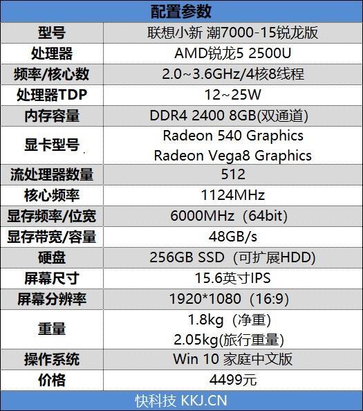 联想小新潮7000-15锐龙版搭载了AMD 锐龙5 2500U处理器,基础频率2.0GHz,最高加速频率3.6GHz,并集成了Vega 8图形处理器,拥有512个流处理器单元。另外还配备了8GB 2666MHz双通道内存、三星PM961 256GB SSD,重量仅为1.8kg。
