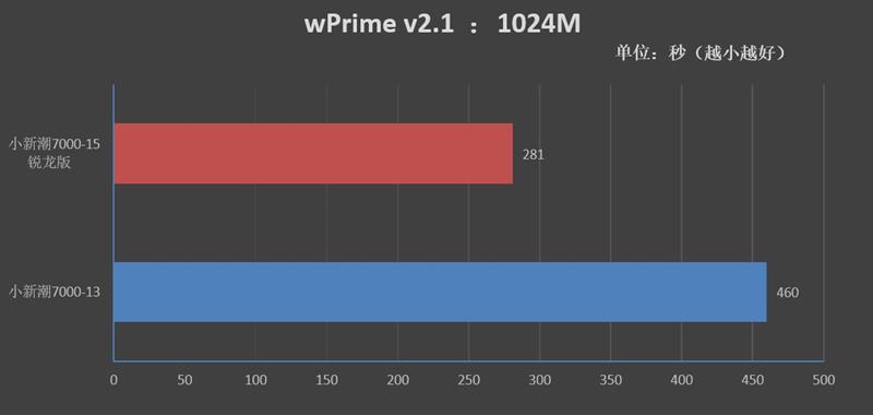 在wPrime V2.10 1024M多线程测试中,小新潮7000-15锐龙版好时281秒。