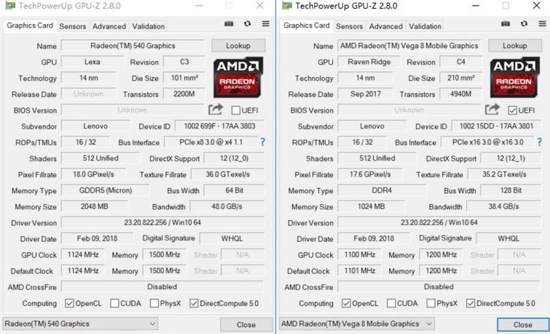 左边是Radeon Radeon 540、右边是Vega 8。这2颗图形芯片的参数几乎一模一样,同样是512个流处理器、16个ROP单元、32个纹理单元, Radeon 540频率为1124MHz,比Vega 8高了那么一点点。