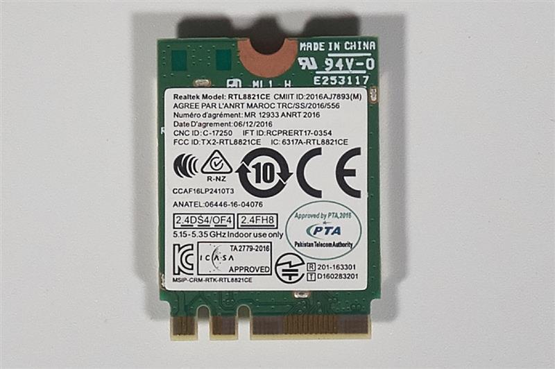 瑞昱RTL8821CE芯片,mini PCI-E接口,单通道1T1R,支持IEEE 802.11a/b/g/n/ac标准,Wi-Fi传输速率最高433Mbps。芯片还内置有蓝牙4.2模块。