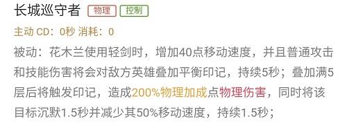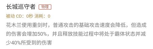 花木兰轻剑形态获得40点速加成,攻击敌方英雄会叠加印记,叠满五层印记可触发1.5秒沉默和1.5秒50%减速的效果。重剑形态攻速降低,但普攻伤害更高,释放技能时获得霸体和减伤。