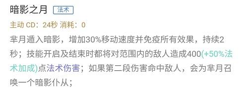 芈月三技能遁入暗影,2秒内获得移速加成,并免疫所有效果。释放和结束时都会造成范围伤害。技能二段命中敌人时会召唤一个暗影仆从。