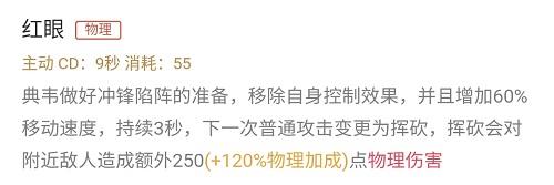 典韦一技能解除控制效果并增加60%移速,持续三秒,强化下一次普攻,造成高额范围伤害。
