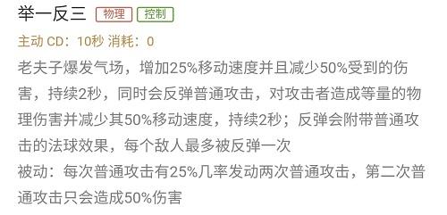 老夫子二技能2秒内提升移速并获得减伤。期间受到普攻会对攻击者造成伤害,并将其减速50%,持续2秒。