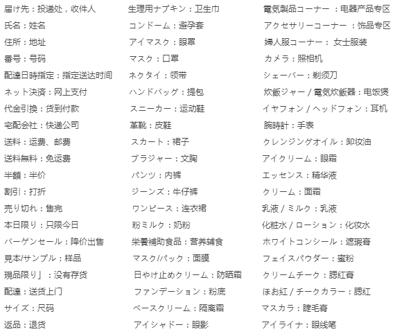 日淘常用到的日语单词