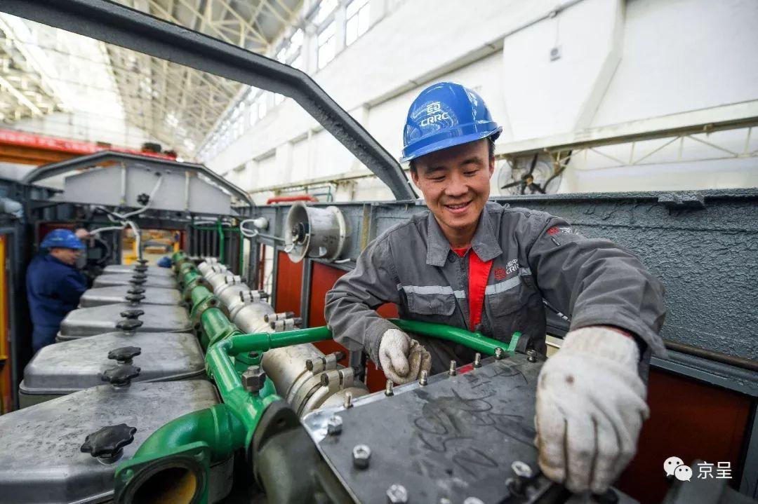 大件班班长、“80后”新北京人王志全为机车安装好“心脏”——柴油机。人生正当年的王志全和厂里众多年轻人一样,未来仍打算钻研技术,在新的岗位继续当“工匠”。