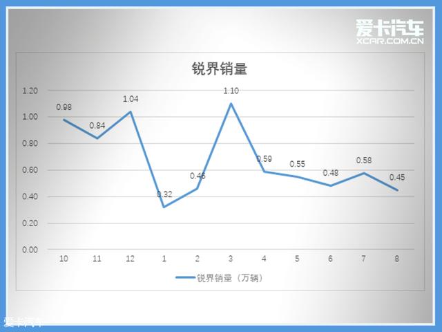 锐界受到整个车市影响,销量稍有波动。新款车型上市后带动了销量的增长,令车辆在2017年第4季度有着不错的成绩。2018年的前2个月,受市场淡季影响,车辆销量有所滑落。到了3月份,销量回暖,达到1.10万辆,成绩突破新高。然而这种势头并没有一直延续下来,自4月份起,锐界的成绩稳定至0.60万辆上下,并保持到所调查月份。