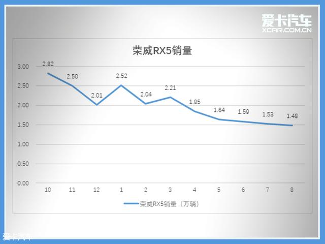 纵观一整年的销量走势,能够看出荣威RX5的成绩较为平稳。上市首月销量突破2.8万辆,有着不错的成绩。尽管11月和12月的成绩有所下滑,不过依旧能够保证月销量2万辆以上的优秀战绩,和车辆本身的品质以及消费者的认可度不无关系。荣威RX5在今年1月份取得开门红,2月份销售淡季也有2.04万辆的成绩进账,较为抢眼。自3月份起,车辆开始有下滑趋势,不过整体依旧能保持相对稳定的势头,月销量也基本能保证在1.5万辆以上。