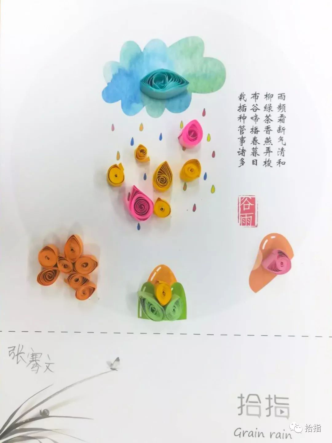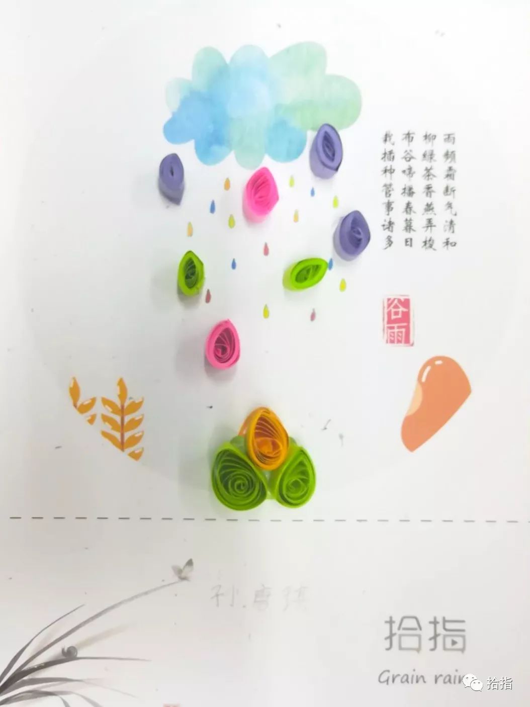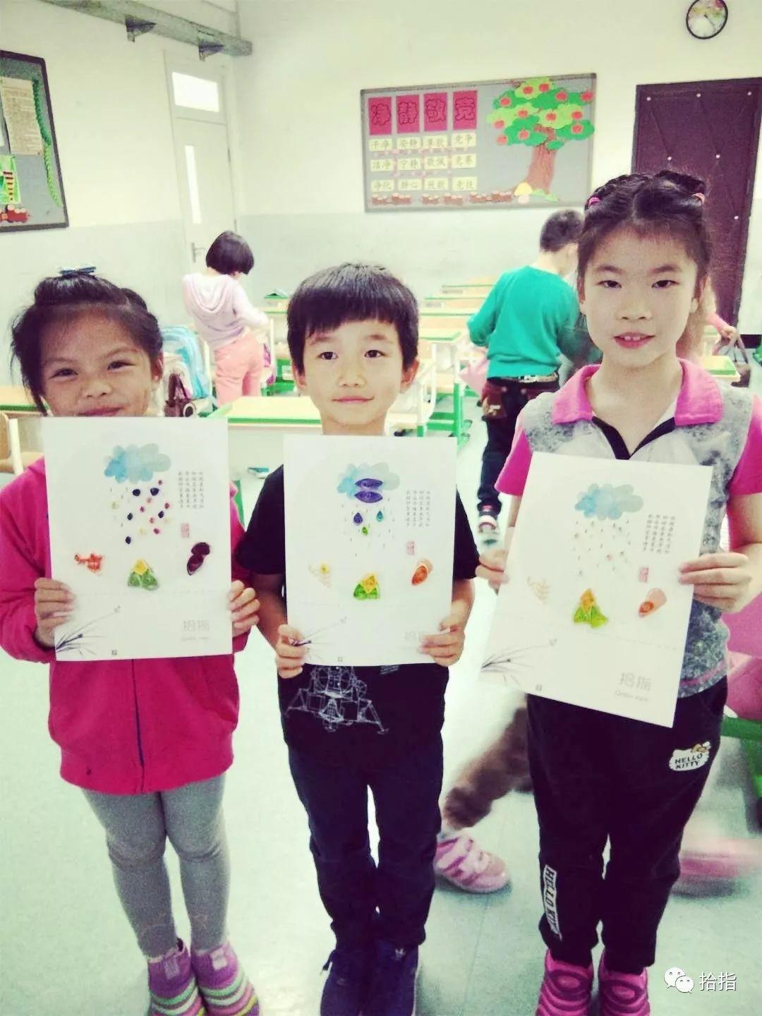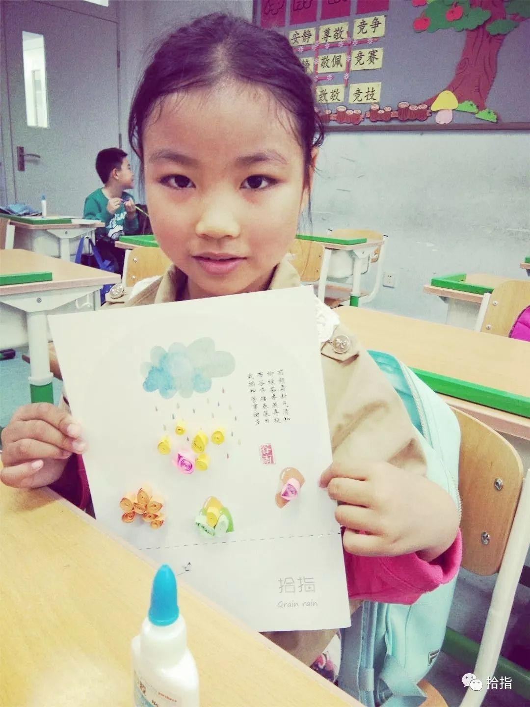 在谷雨这一天,各地都有不同的习俗,如禁杀五毒、走谷雨、喝谷雨茶、祭海、食香椿、赏谷雨花、祭仓颉等。而在新鲜胡同小学,学生们则亲手制作着二十四节气衍纸谷雨作品,将自己心中的谷雨时节,用衍纸的形式表现出来。学生们兴致勃勃,积极参与,在拾指老师的指导下,制作出精美“谷雨”衍纸作品,师生们愉快地度过了这春季的最后一个节气。