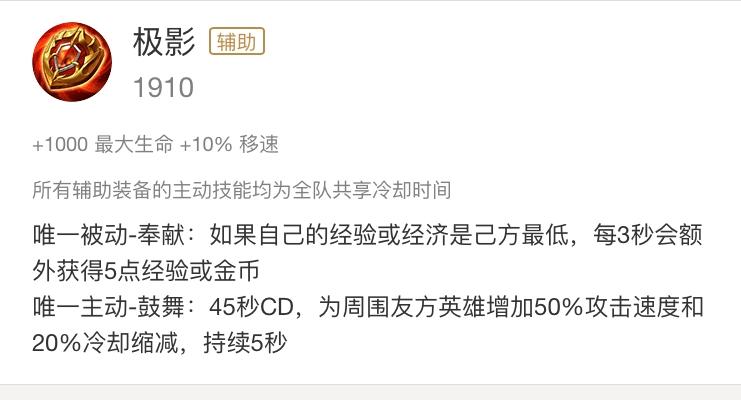 极影这件辅助装备,小编在玩了几千场游戏中出现的次数绝对是最少的辅助装备了,但是这件装备的性价比在前期绝对是非常的高的。那么这件装备适合那种阵容出呢?这件装备主动效果是减少CD,和增加攻速,若辅助为明世隐,打野为成吉思汗或者是其他射手英雄,那么明世隐第一件辅助装备可以选择极影。因为明世隐的被动是A3下触发眩晕,射手吃攻速。当主动效果触发的5s内,这两个角色的输出是远远高于如今的主流出装的(明世隐出救赎盾)。其次,从团队而言,4级-7级的团战是游戏前期非常重要的一个时间点,同时这个时间点刚好辅助可以出一个辅助装出来,那么这波团战,这个时间点极影的效果个人认为是最好的,因为不管哪个英雄都吃CD,所以第一波团谁的技能转的快,谁能打出输出的机会就更多,团灭对手也更有机会。