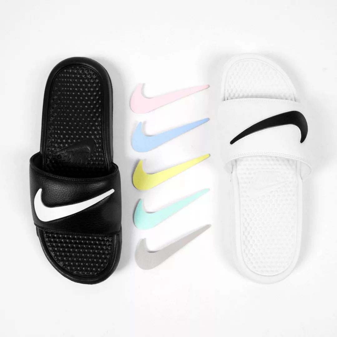 在夏天,最终极的选择还是拖鞋!Nike 换勾的玩法终于应用在拖鞋上,经典的 Benassi JDI 可以搭配六种不同的 Swoosh Logo 魔术贴,想怎么玩就怎么玩,一瞬间小编就已经想到了十多种搭配!