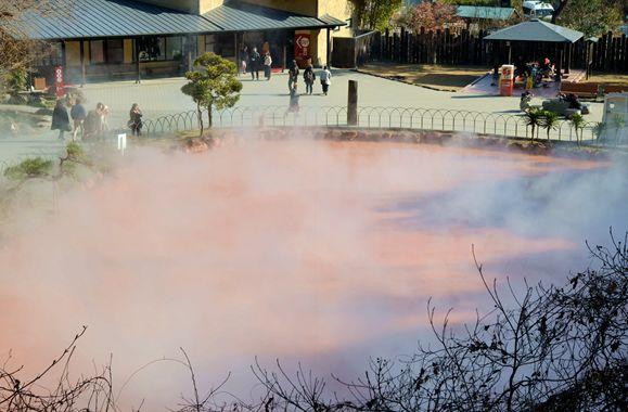 泛着血红色的泉水,是“血之泉地狱”最奇特的地方。这好似“地狱”的血红色泉水,其实是得益于水中富含的铁元素。据悉用温泉的红黏土制成的血池软膏对治疗脚气很有效。