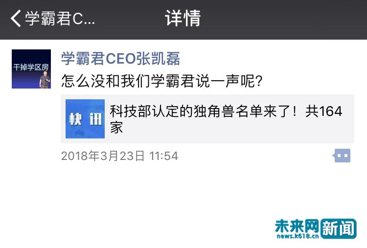 榜单公布当天,猿辅导和作业帮都通过官方微博、微信公众号发布了“科技部公布2017年独角兽名单,里面有我”等相关消息。而学霸君CEO张凯磊则在朋友圈转发了《科技部认定的独角兽名单来了!共164家》的快讯,并附短评“怎么没和我们学霸君说一声呢?”