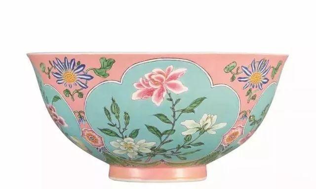 但此御制珐琅彩花卉碗,罕见地以粉红作地,以五瓣花朵式开光,内绘花卉,色彩艳丽,笔触细腻。