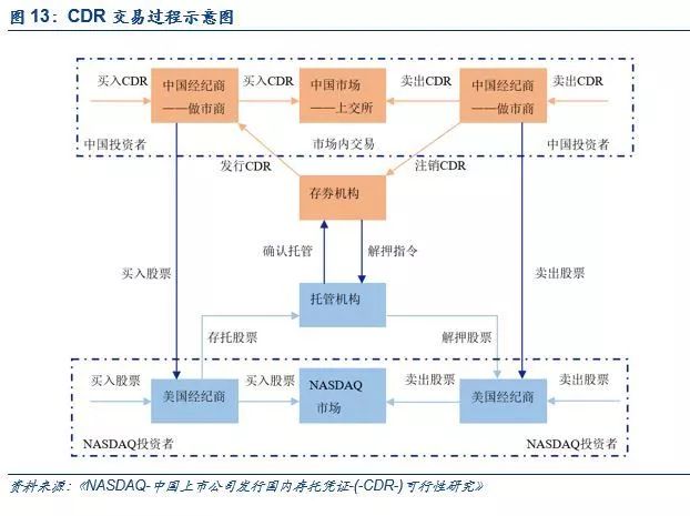 至于CDR的交易过程,我们可以借鉴美国存托凭证ADR的过程,主要由国内外做市商、托管机构承担主要角色和中间桥梁,实现跨境市场间的交易。